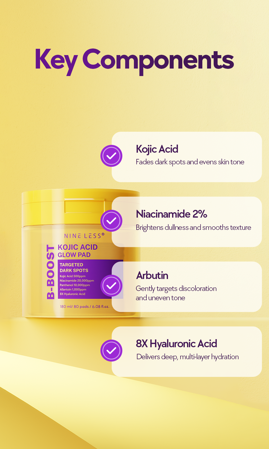 Formulated with Kojic Acid and Niacinamide — two dermatologist-trusted brightening agents — this daily toner pad visibly reduces the look of dark spots, hyperpigmentation, and uneven skin tone.